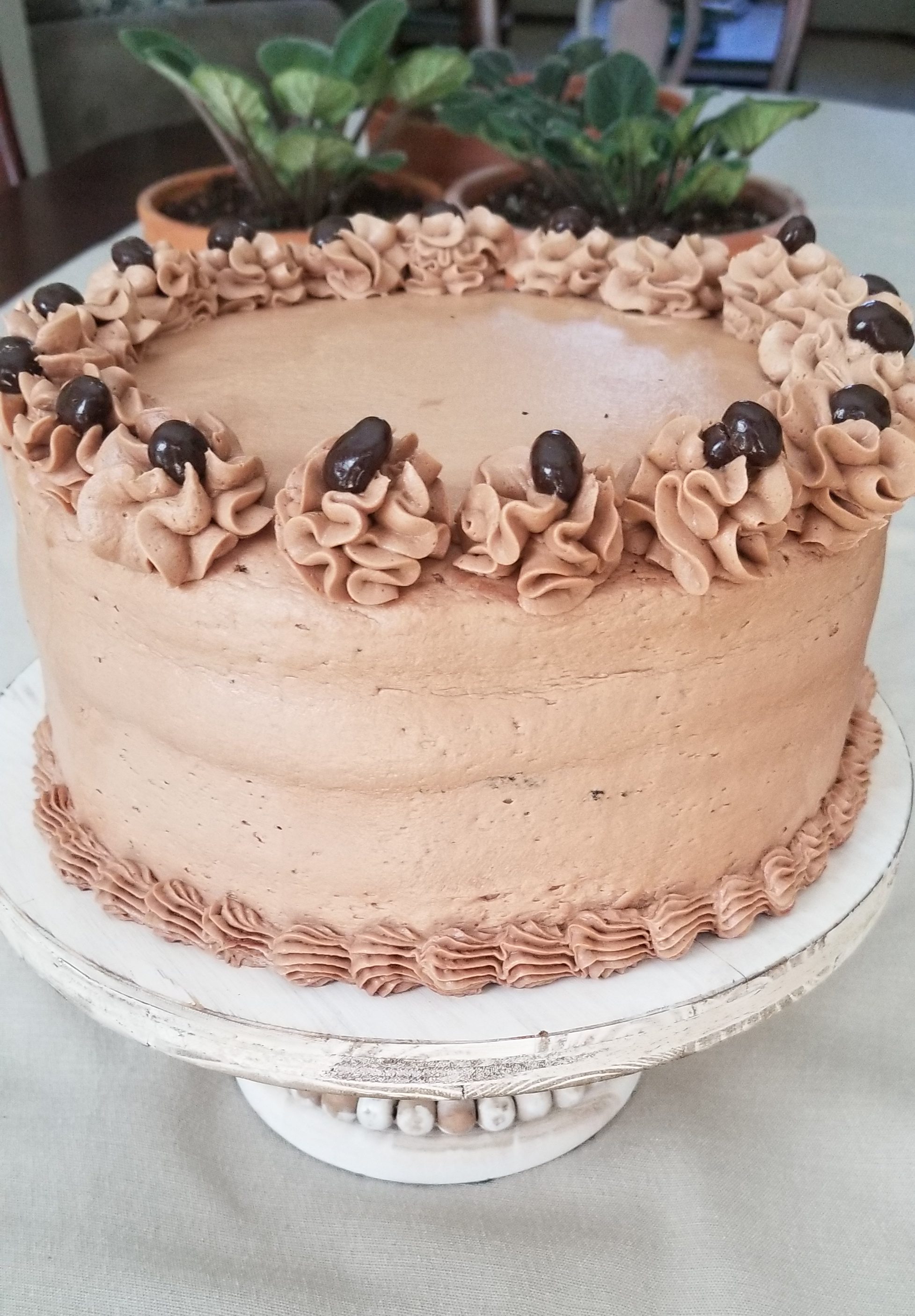I decided I wanted to garnish the cake with chocolate covered espresso beans, so I went to the store and bought some in bulk. When I got home, I reached my hand into the bag, pulled out a candy, and popped one in my mouth. To my dismay, I realized I had accidentally bought a bag full of chocolate covered raisins! I like chocolate covered raisins well enough, but I like chocolate covered espresso beans so much more. For all you coffee lovers out there, I’m sure you could imagine my dismay haha. But not to worry! I fixed my mistake by buying the real thing later 😉 .
