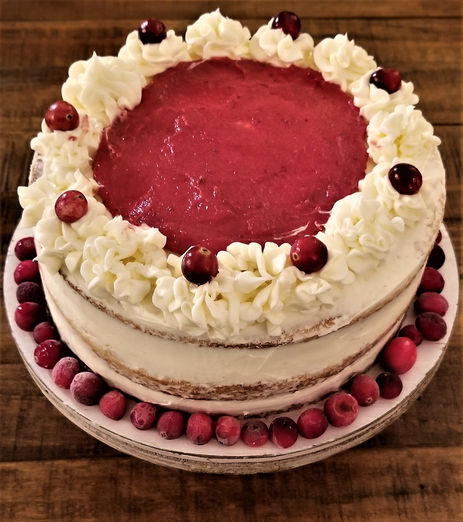 - Frost top and sides of cake and spread remaining 1/3 cranberry curd on top. Decorate the top as you desire. I used cranberries and rosemary sprigs, but you can also use pomegranate seeds or whatever else you prefer.