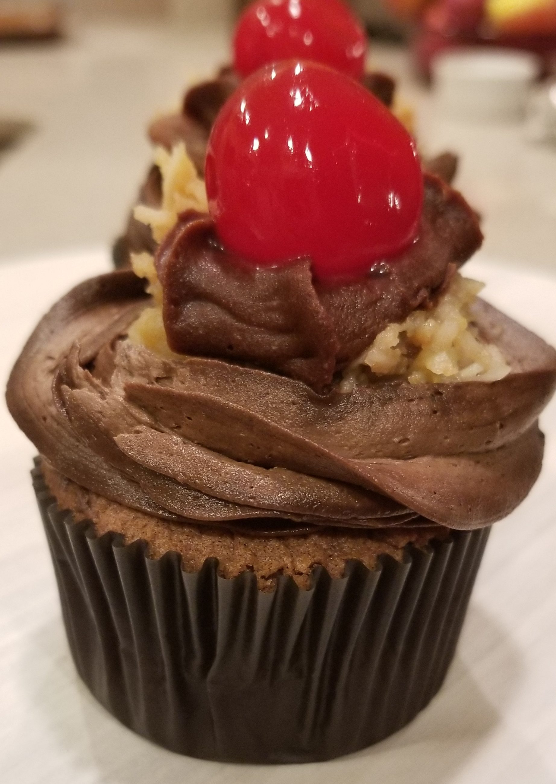 - Assembly: Pipe a ring of frosting around the edge of the cupcake. Spread a couple spoonfuls worth of coconut pecan mixture in the middle of the ring. Pipe a dollop of fudge icing on top of the coconut pecan mixture and place a cherry on top.