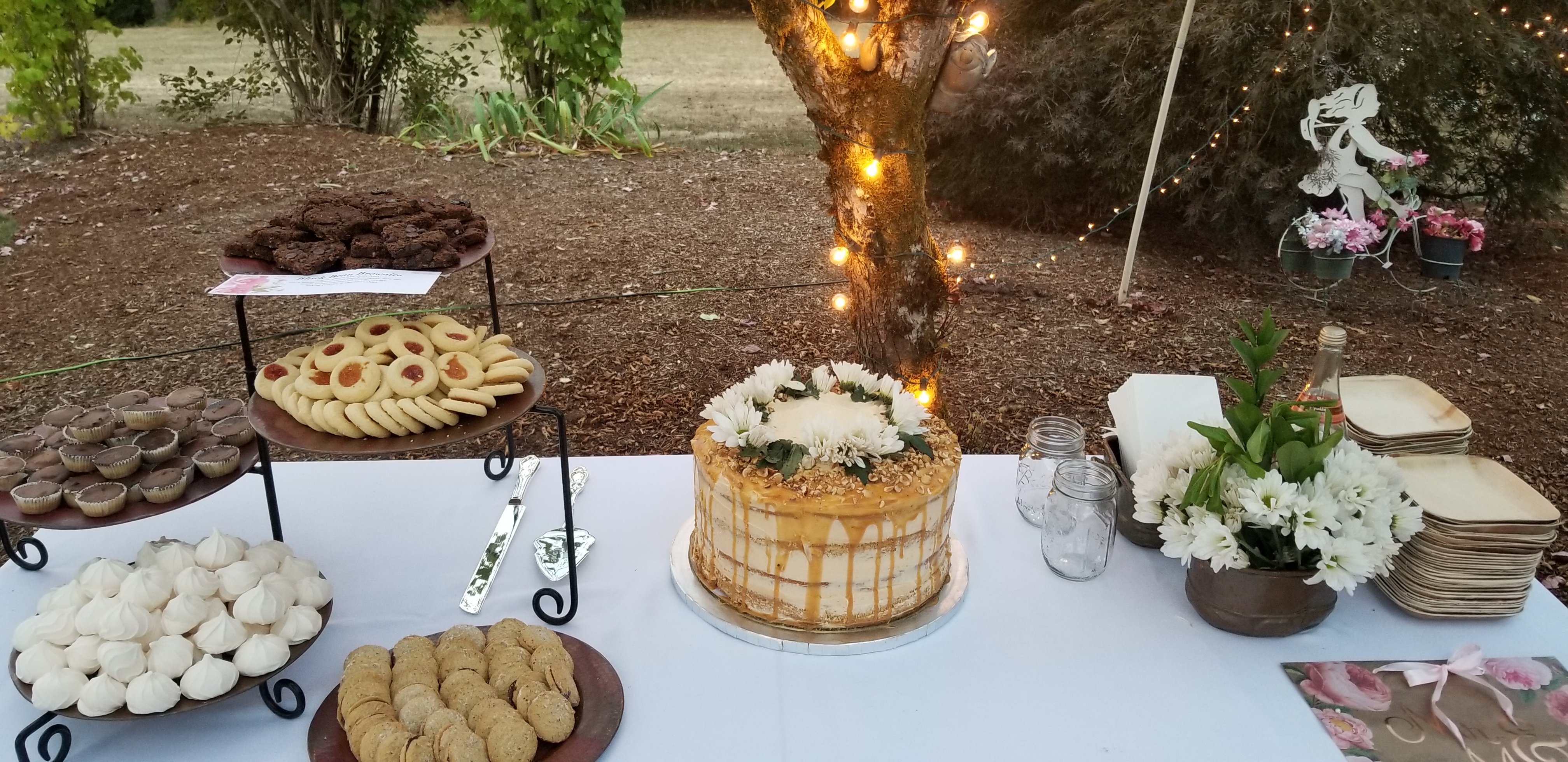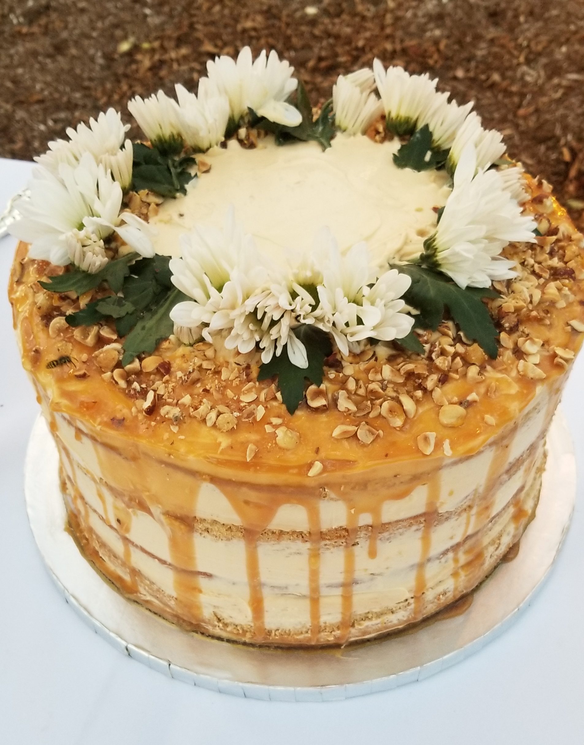 Yesterday was the day of the wedding, so once I got off work, I headed straight over to the venue. It was at the bride’s grandparents’ house out in the country and the setting was absolutely beautiful. We were blessed with a gorgeous warm autumn day. Once I arrived at the house, I got straight to work in the kitchen. Everything went pretty smoothly. I made five layers of cake, making the fifth one in case of an emergency. I’m sure glad I did because I broke one of the layers and almost broke the backup… The only problem I ran into was that the kitchen windows caught all of the afternoon sun and my frosting and caramel started to melt! So I hurriedly frosted the cake and added the salted caramel drip and rushed it straight to the fridge to set. Did it look as I was hoping it would? No. Did it look awful? I don’t think so.